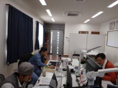 この日は、施工図の確認やケーブルルートの検討、資材の発注に向けた準備など、事務所での作業に集中していました。