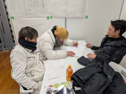 現場に出ていると、どうしても図面の読み方や施工の細かな手順など、その場では聞ききれない疑問が出てくるものです。今回は、若手スタッフを中心に図面を広げ、みんなでじっくりと教え合い、学びを深める時間を作りました。